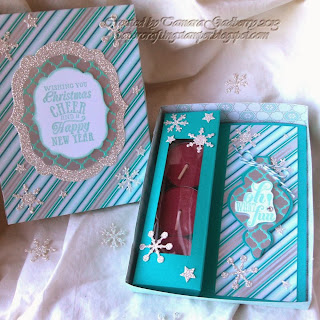 I used the dsp 'Winter frost' and our silver glitter paper to create the box and card, my card base is 'island indigo' cs, the sentiments were from the 'Christmas messages' set in the holiday mini, on the top front of the box I used the framlits 'labels' collection and made 3 layers with them, I love this layout so much that I think I will make a card using this design (smiles) the small snowflakes and stars are from an older small die I have, I used the silver glitter paper for these, they are so pretty and sparkly.